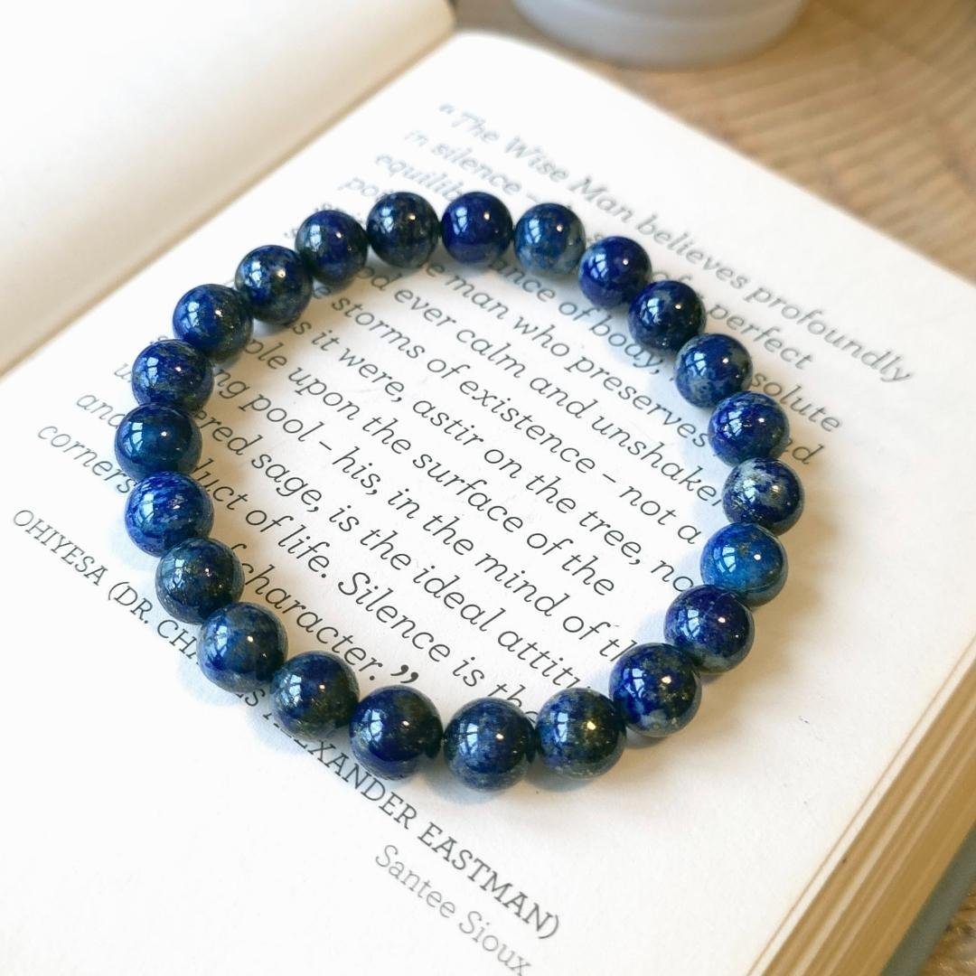 Natürliche Lapis-Perlen mit individueller Maserung – jedes Armband ist ein Unikat. Glatte, angenehm zu tragende Oberfläche; hochwertig vergoldeter Charm und robustes Elastikband für bequemes An- und Ausziehen.